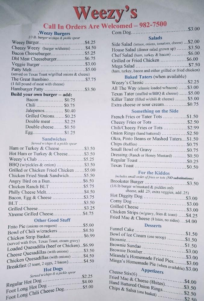 Welcome to Weezy's Restaurant, your go-to spot in Blossom, TX, for delicious American cuisine! Conveniently located at 204 Front St, we offer a cozy atmosphere perfect for lunch, dinner, or a solo meal. Enjoy our extensive menu featuring excellent coffee, mouth-watering desserts, and local specialties, all served with quick and friendly service. We cater to all with wheelchair accessibility and kids' menus, making it a great choice for families and groups alike. Whether you're dining in, taking out, or enjoying delivery, Weezy's is here to serve you. Come by and savor the taste of comfort food today!